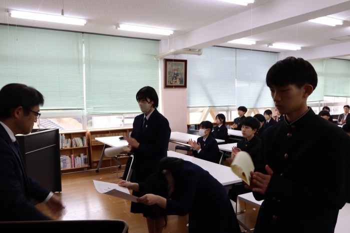 終業式の前には表彰伝達式があり、税に関する作文や読みたい本POPコンクール等で受賞した3名の生徒にそれぞれ表彰状が手渡されました。