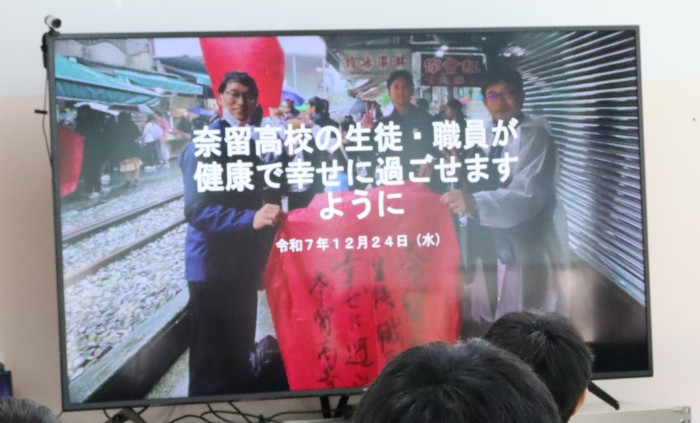 終業式の校長訓話では、"My Grown-up Christmas List" という曲が紹介され、自分のことばかりではなく周囲の人や世界の人々にも目を向けてみんなの幸せを祈るということについてのお話がありました。この曲は、生徒や職員は聞いたことがある人が少なかったのですが、ALTのソフィー先生はよく知っていて有名なクリスマスソングなのだそうです。