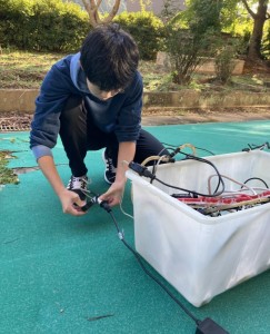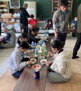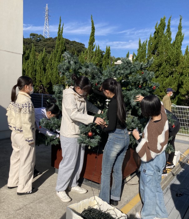 生徒たちは主に組み立てたツリーに飾りをつけたりイルミネーションを固定する作業をしましたが、やってみると、思っていたよりも時間と手間がかかる作業で、午前中には終わらず、DON DON 奈留の皆さんが炊き出しをしてくれたカレーとうどん(両方でした!)をいただいて午後も作業をしました。