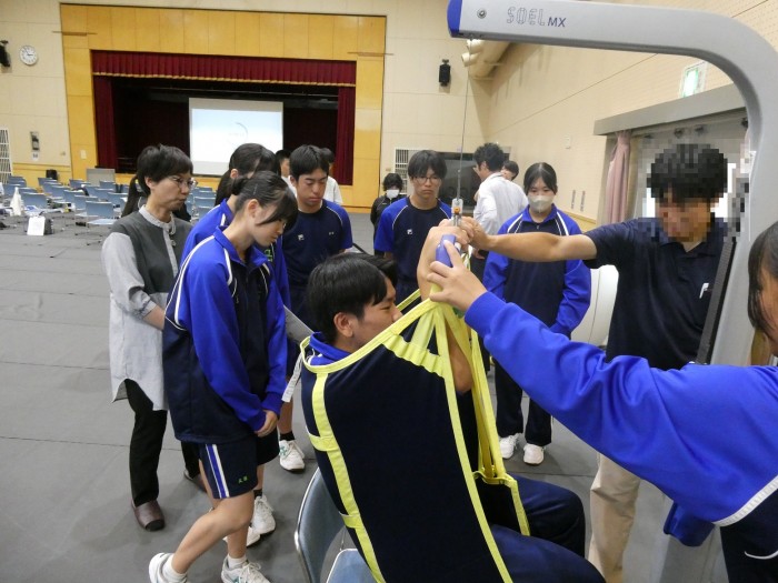 介護ロボットとは、高齢者や障がい者の生活支援や介護者の負担軽減を目的として開発されたロボット技術を活用した機器のことで、課題解決策の一つとして注目されています。その用途も、移乗支援から入浴支援、コミュニケーション支援など幅広く活躍が期待されています。見慣れない介護ロボットの登場に生徒達も興味津々でした。