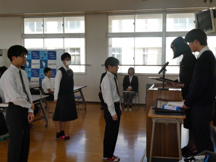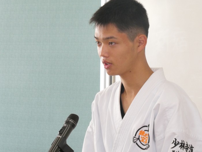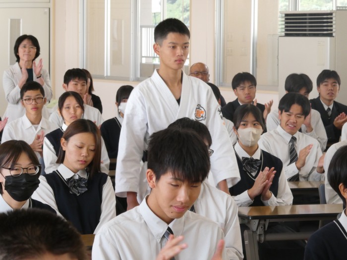 また、全校生徒の前で空手の『型』を披露し、いつも学校で見せる朗らかな様子とは違う機敏で凛々しい姿に全員が圧倒されていました。壇上で語った抱負の通り、全国大会という大きな舞台で練習の成果を存分に発揮してください!