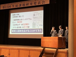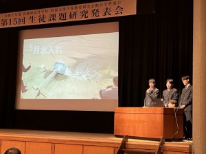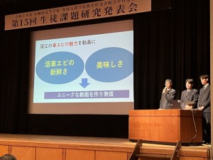 12月15日、諫早文化会館にて、「第15回生徒課題研究発表会」が開催されました。県下の総合学科8校よりそれぞれ代表の1班が出場し、今年度の活動内容を発表しました。本校は、「深江の車エビ ~認知度&収益Wアップ大作戦!~」のテーマで取り組んだ3年の代表班が発表しました。