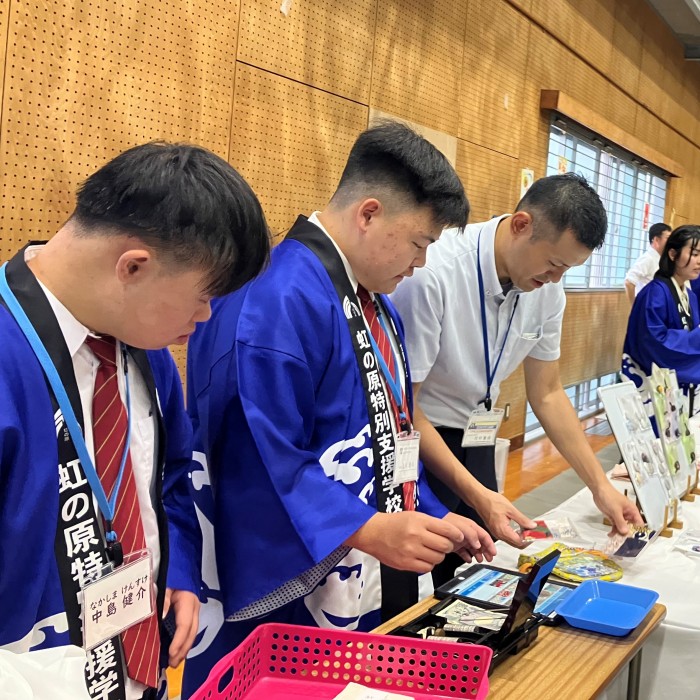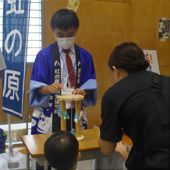 バザー販売では、対馬高校の生徒と一緒に「いらっしゃいませ」と呼び込みをして、たくさんの方々に製品を手に取っていただきました。また、「組みひも」の実演コーナーを設けて、製作する様子を見てもらったり、体験してもらったりしました。見学者からの質問に答えたり、体験に来た幼児や児童に優しく教えたりして、交流を図ることができました。