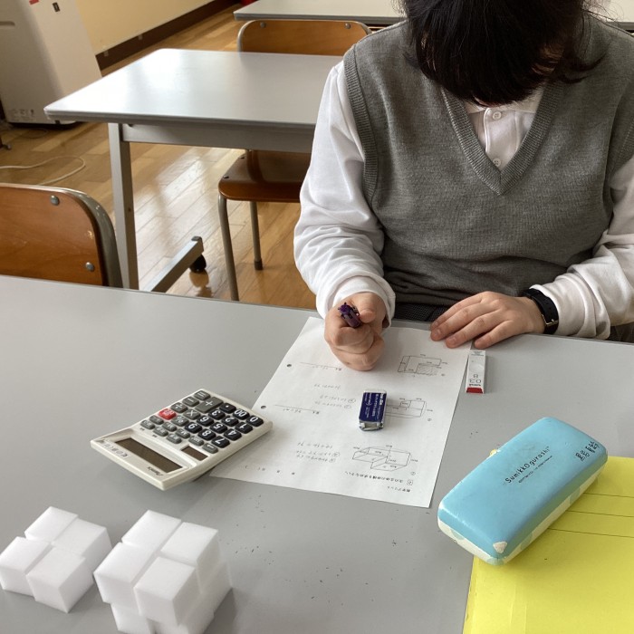 直方体の体積の公式を活用し、模型を使ってイメージしながら問題にチャレンジしました。