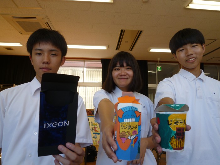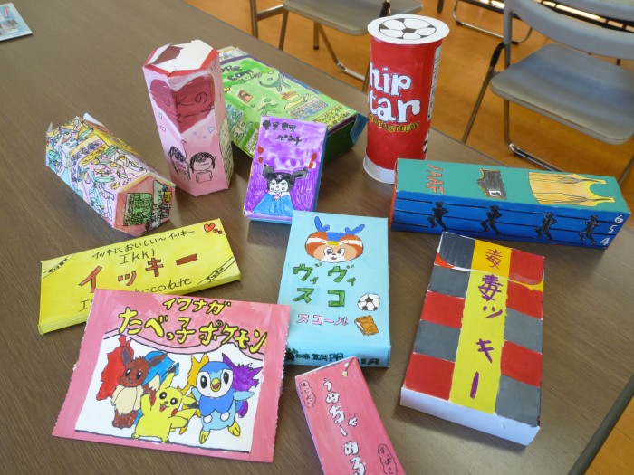 1学期に2年生の授業で、お菓子のパッケージデザインと制作に取り組みました。
