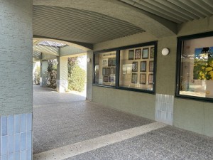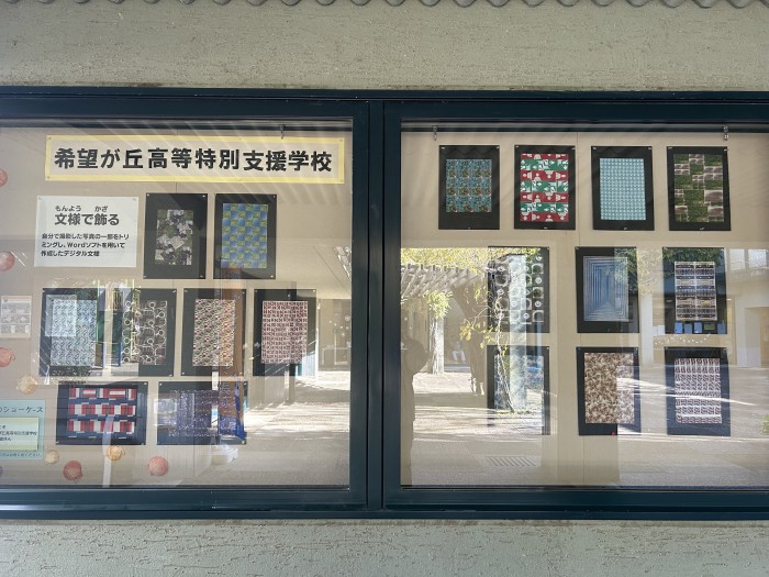 たらみ図書館 海の回廊に、3学年の選択美術の授業で制作した、「デジタル文様」を展示しています。