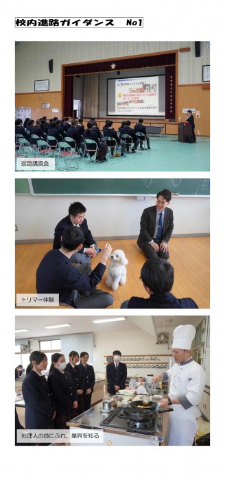 午前中の進路ガイダンスでは、進路講演会の後、18講座のなかから各50分1人2講座で職業体験型ガイダンスを受講しました。中には、実技指導で犬同伴のトリマー体験や、調理士によるデモと試食会もあり、普段できない経験を通して将来の職業について考えることができました。