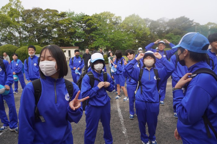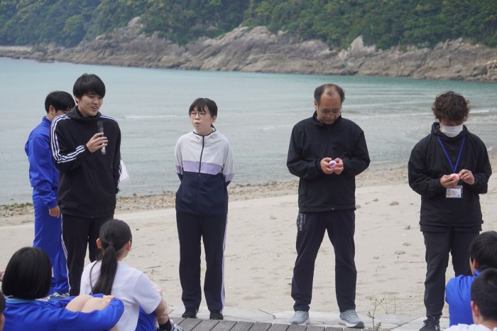 遠足で親睦を深めた後、海岸清掃ボランティアを行います。
