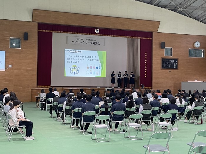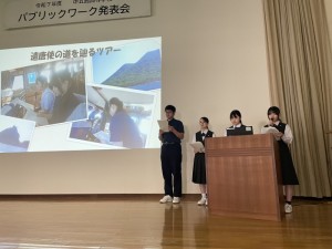 10月23日(木)午後に、「パブリックワーク発表会」を実施しました。地域課題解決型学習として、2学年が中心となって取り組んできました。その成果を、ご協力いただいたアドバイザーやサポーターの皆様をはじめ地域の方々や小学校の児童も参加していただいた中で、発表することができました。