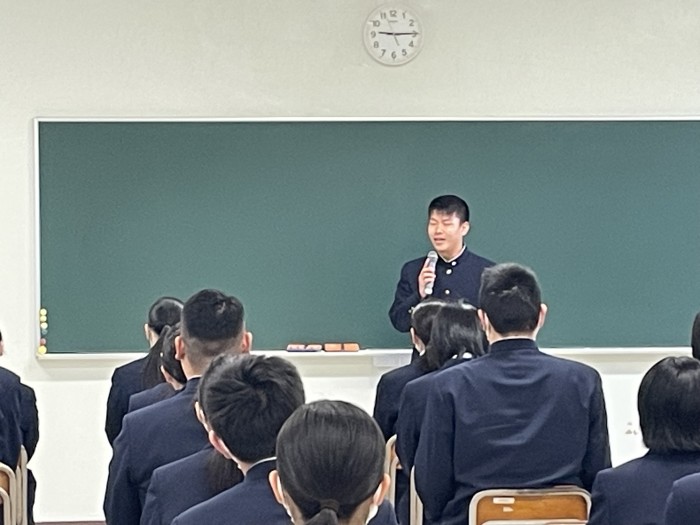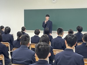 1月8日(木)、大学入学共通テスト激励会が行われました。本年度は3年生アカデミックコースより1名受験予定です。受験する川上丈太朗さんは、「自分の力を十分発揮できるように一生懸命臨みたい」と決意を述べました。また、生徒を代表して2年生アカデミックコースの大瀬良一星さんが激励の言葉を述べました。激励を受けた川上さんは、ぜひとも良い成果が出せるよう、来る1月17日(土)、18日(日)では力を尽くしてほしいと思います。また、現2年生は来年度受験生となります。先輩が頑張る姿に刺激を受け、これからの学習に励んでもらいたいと思います。