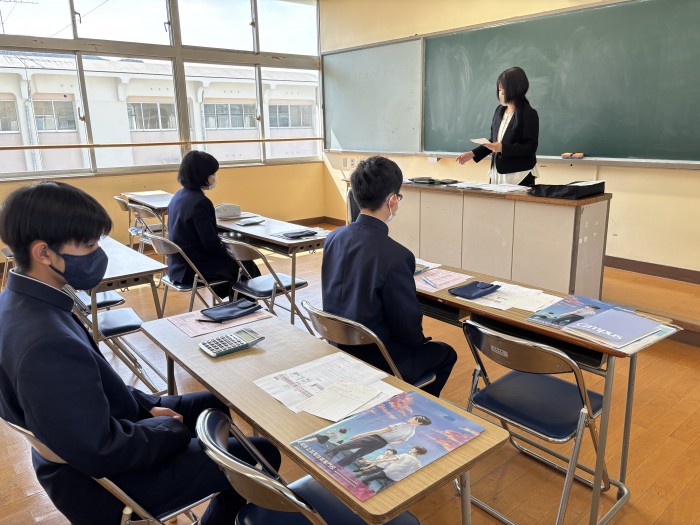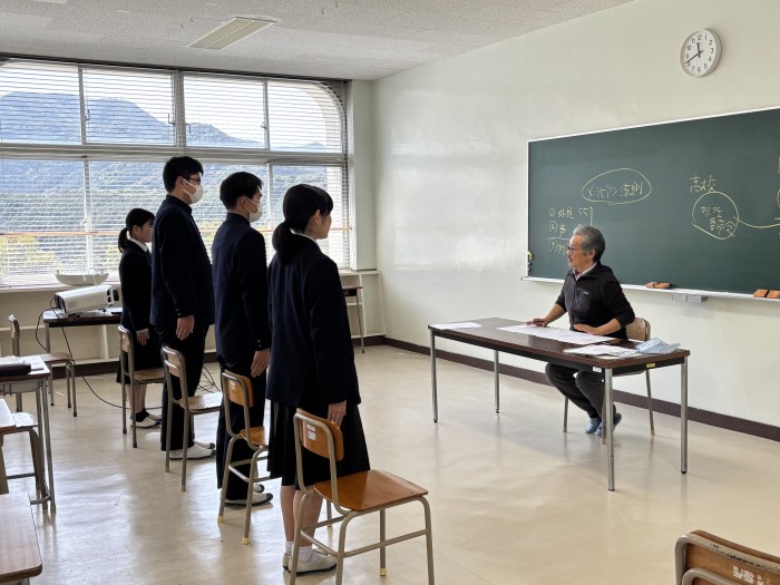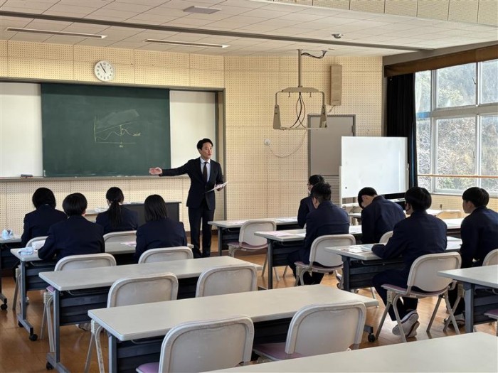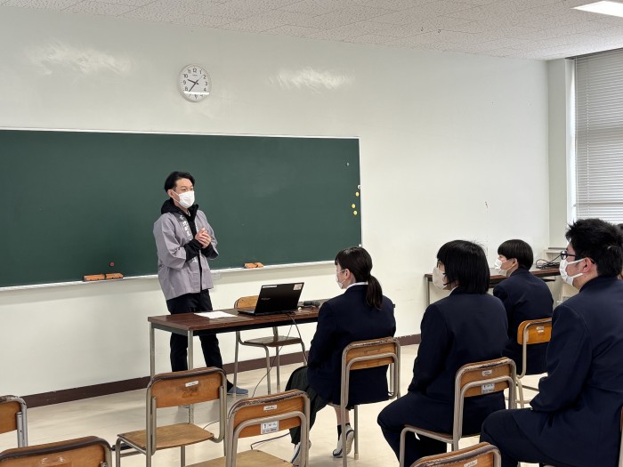 教頭による進路講話、大学・専門学校による進路別ガイダンス、就職希望者に対する筆記・面接試験対策講座、県内企業によるオンライン説明会などが行われました。また、五島灘酒造株式会社の代表取締役 田本 佳史 様にも来校していただき、進路選択への向き合い方や新上五島町における産業のあり方などについてご講話いただきました。