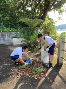7月31日(月)午前7時30分より、3年生有志で、奈留神社横にある戦没者慰霊碑のボランティア清掃を行いました。一年分の落ち葉や枯れ枝、雑草を取り除き掃き清めて、最後に全員で手を合わせ、平和を祈りました。