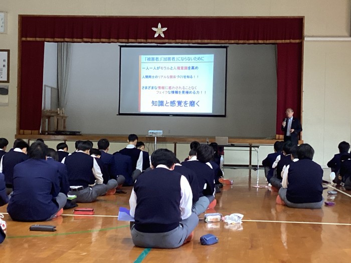 今回は、長崎県メディア安全指導員の梅木澤 茂 先生をお迎えし、LINEなどのSNSやメールが原因で起こるトラブルについて学びました。実際の事例を通して、インターネット上で被害者・加害者にならないためにはどうすればよいかをみんなで考えました。