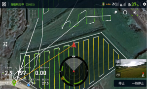 これまでは、圃場内を歩きながら、散布機で散布する方法だったそうですが、事前に圃場を計測して、農業用ドローンの自動航行を使い、飛行ルートの確認、シャッター開度・インペラ回転数の設定、飛行高度・速度を確認しながら、散布しました。
