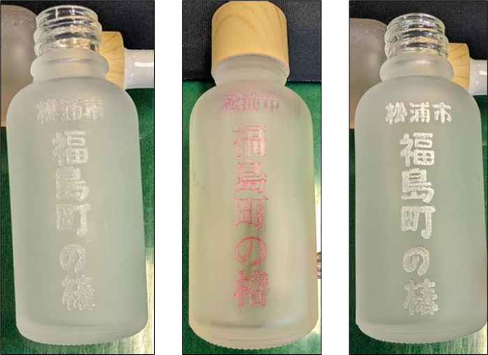 レーザーの出力を、アクリル彫刻用、ガラス彫刻用や金属加工用のマーキング剤を使用したり、アクリル絵の具で色付けしたりと試していきました。