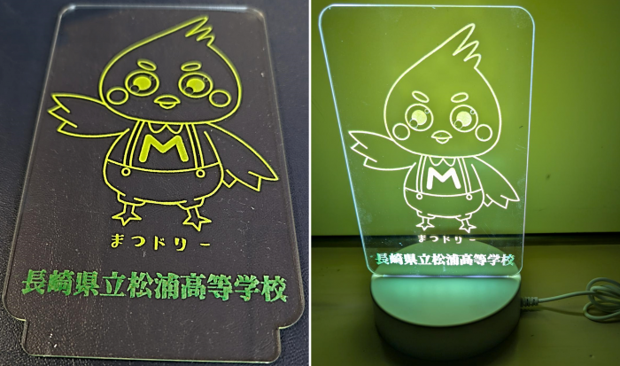 上と同様に、マスキングされたアクリル板の裏側にレーザー彫刻して、アクリル絵の具で色付けを行いました。暗闇で光るアクスタまつドリーはとてもきれいでした。 |
