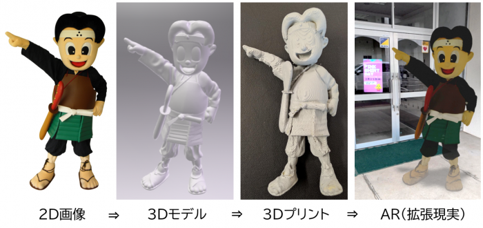 生成AIを活用し、2D画像から3Dモデルを作成し、3Dプリンタで出力しました。プリント後の積層痕が目立つ部分は、やすりがけ等の補正をして、最終的に模型作りでよく使われるサーフェイサーを吹き付けて完成させました。また、スマートフォンを使用すると、AR(拡張現実)の表示が可能だったので、本校玄関先での記念撮影をしました。すぐそこに、「松浦松之助」がいるような感じになりました。