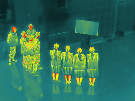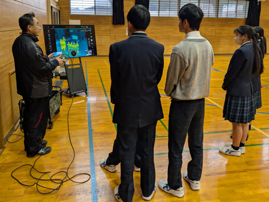 また、令和7年度DXハイスクールの取り組みとして、サーマルカメラ搭載ドローンが納品され、テスト飛行してみました。サーマルカメラとは、対象物が発する熱エネルギーを検出することで、温度を測定します。物体は温度に応じて赤外線を放出しており、サーマルカメラはこの赤外線を感知するセンサーを搭載しており、温度が高い部分は赤く、低い部分は青く表示されるため、視覚的に温度分布を把握することができます。電力、救命救助、公共安全、森林保全など、幅広い業界で利用されています。