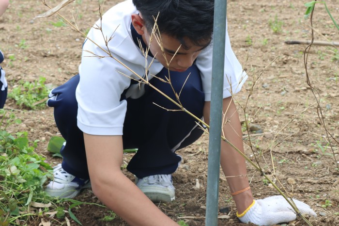 今回は、小柳千敏様を講師に迎え「菜園管理」をおこないました。最近雨が続き、土の状況が良くないことから、苗植えについてはサツマイモのみとなりましたが、その他に草抜きや肥料まきをおこないました。3月に植えたスナップエンドウが実をつけ、トウモロコシも順調に成長をしていました!