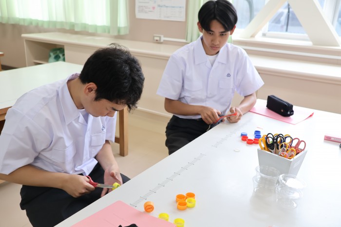 今回も悪天候のため、校外での漂着物調査は実施できませんでした。その代わりに、前回講師としてお招きした山口様、泉井様に来ていただき、ペットボトルキャップを使ったアップサイクルで、ネームプレートを作製しました。それぞれのデザインにあった色を選び、細かく切って、アイロンで溶かして作りました!