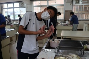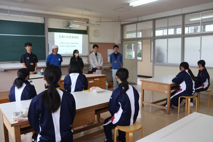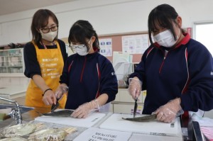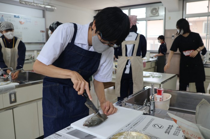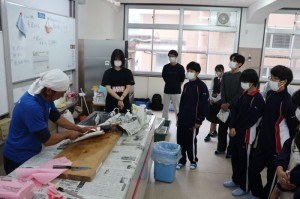 今回は「水産教室」をおこないました。はじめに、五島市の水産業について学び、その後、講師の川上様より魚の捌き方(三枚おろし)を学びました。そして、今年はギンガメアジの三枚おろしにチャレンジ!自分でさばいた魚をホイル焼きにしていただきました!