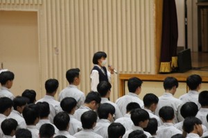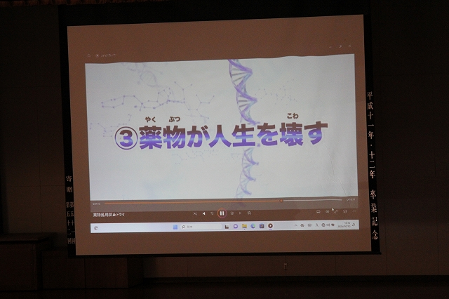 講師は、昨年度まで建築科の先生として勤務されていた藤武先生を招き、現在「保護司」として犯罪や非行をした人たちが再び罪を犯すことがないよう、その立ち直りを支えるボランティア活動をされていて、その経験から『薬物乱用』について『薬物に犯された人の転落人生』と 『薬物の種類や毒性、医薬品の間違った使い方』等のビデオ上映があり薬物乱用の怖さを知ることができました。