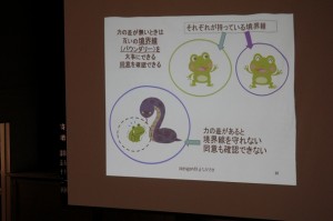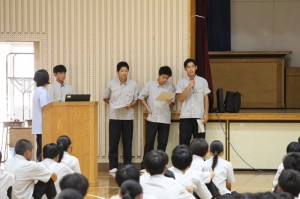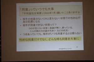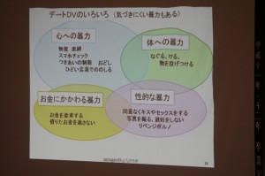 「対等な関係をつくるために」について講師の方を招き、お話しいただきました。パワーポイントや資料を使い、わかりやすい説明でセルフチェックする時間や生徒がロールプレイを行ったり、質問に対してインタビュー形式で答えたりなど実践的にデートDVについての問題点、データにもとづいた課題について向き合うことができ相手との対等な関係をつくることの大切さを学ぶことができました。
