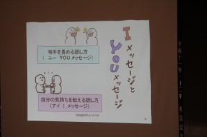 暴力に出会ったら 「NO GO TELL」 「NO」いやだと言う。 「GO」離れる、逃げる。 「TELL」誰かに相談する。 や「YOUメッセージ」相手を責める話し方より 「Iメッセージ」自分の気持ちを伝える話し方、で対話することの大切さなど日常生活に取り入れることができる内容の講話でした。