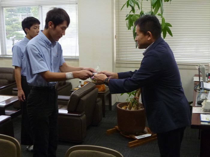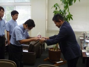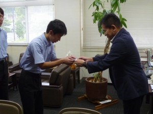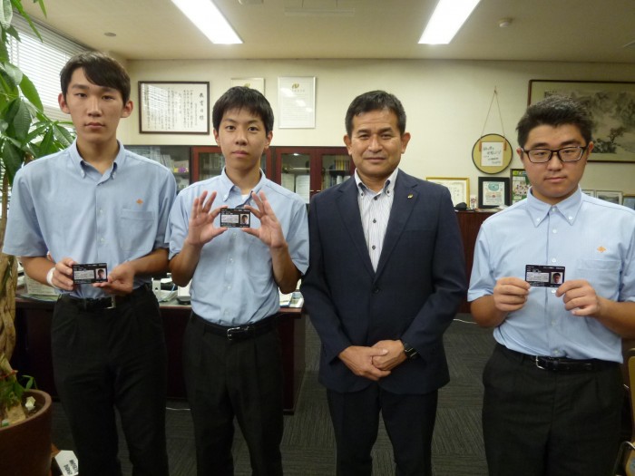 今年度第1回目のドローン操縦士技能認定証の交付式を行いました。今回は、放送新聞部の部員3名が夏休みに受講し、学科試験と飛行技能試験に合格しました。 放送新聞部の今年度の活動目標に動画制作をあげており、映像に空撮を取り入れたいとの思いからドローン操縦士の資格取得にチャレンジしました。3名とも夏の強い日差しの中、真剣に取組み見事合格しました。 松尾校長先生から技能認定証を交付していただき、これからの活動に生かしていく決意を述べていました。