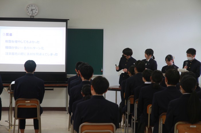 これまでの活動で行ってきた商品の企画・仕入れ・販売活動を振り返り、売上や経費、利益の状況について生徒が資料を用いて報告しました。