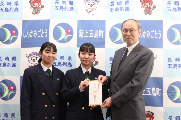 2月26日(木)、模擬会社LiNKの社長(藤本さん)と副社長(中山さん)が新上五島町役場を訪れ、1年間の活動で得た利益の一部を寄附しました。役場では石田町長に寄附金を直接お渡しすることができ、その後は新上五島町の現状と未来について、お話をお聞きすることもできました。