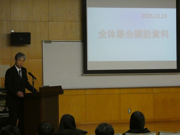 12/24(水) 冬季休業前の全体集会が行われました。講話で立木 英邦 校長先生は、様々な学校