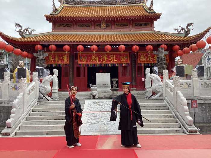 2月5日(木)、中学部1、2年の社会科の学習の一環で校外学習を行いました。長崎市の孔子廟やランタンフェスティバルの会場となっている湊公園から長崎新地中華街を巡り、最後に眼鏡橋を見学しました。孔子廟では、中国の建築様式である鮮やかな色合いや装飾を間近で見て、気づきを話したり、何を表しているのか考えることができました。漢服を着る体験も行い、中国の文化を肌で感じることができました。