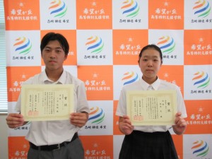 主催者の独立行政法人高齢・障害・求職者雇用支援機構長崎支部から3名の方が来校され、金賞を受賞した坂井 恋さん(喫茶サービス)、三木悠翔さん(ビルクリーニング)に賞状が授与され、激励の言葉もいただきました。他にも銀賞に4名、銅賞に3名、金賞と合わせて9名の生徒が入賞しました。