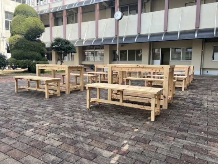 3月16日(月) 諫早商業高等学校様より受注いただいた、テーブル6台、ベンチ12台を納品させていただきました。