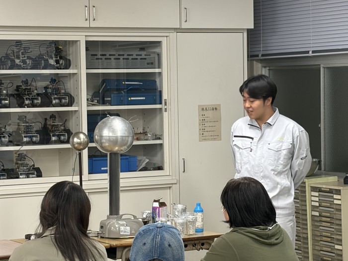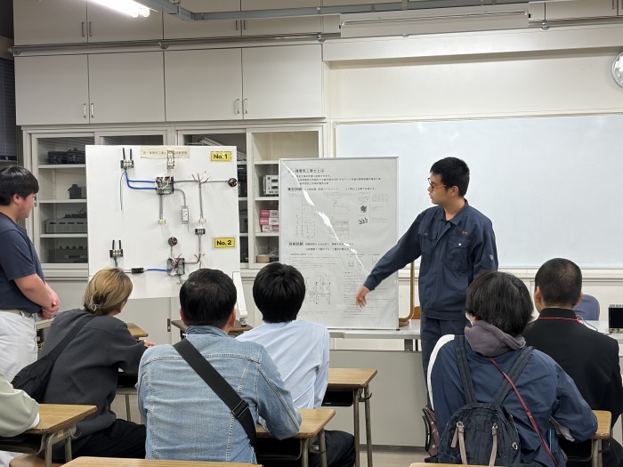 令和7年11月6日(木)オープンスクールを実施しました。4年生が授業や資格取得、課題研究の作品について説明をしました。参加していただいた中学生や保護者の方は熱心に生徒の話を聞いていました。今年度は、各学科課題研究等で作成した記念キーホルダーをお贈りいたしました。