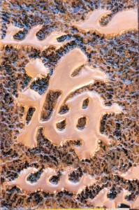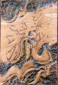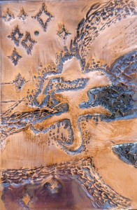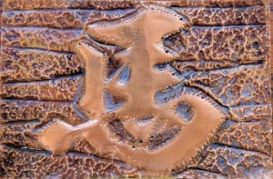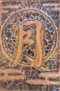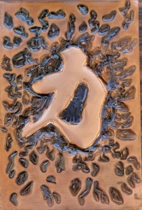 作品は、銅板に漢字を書いて背景をアレンジしたものです。1年生の美術の授業で作成したものです。