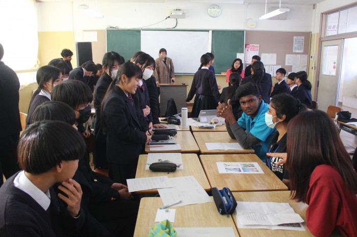 令和7年12月18日(木)5、6時間目に、長崎短期大学の留学生37名(中国・フィリピン・スリランカ・ミャンマー出身)と、佐世保東翔高校1年生による国際交流を行いました。各国の文化や食、通貨、言語について学んだ後、グループに分かれて自己紹介や自由な会話を楽しみました。生徒たちは積極的に質問や意見を交わし、異文化への理解を深める大変有意義な時間となりました。