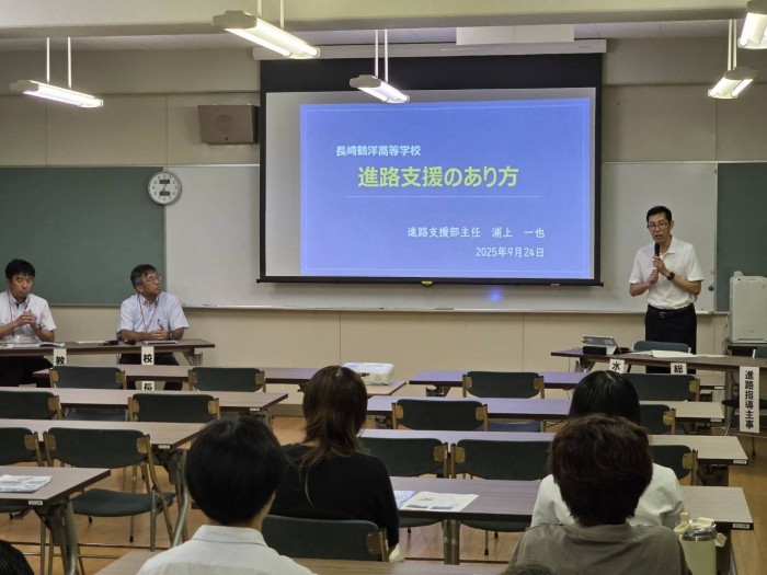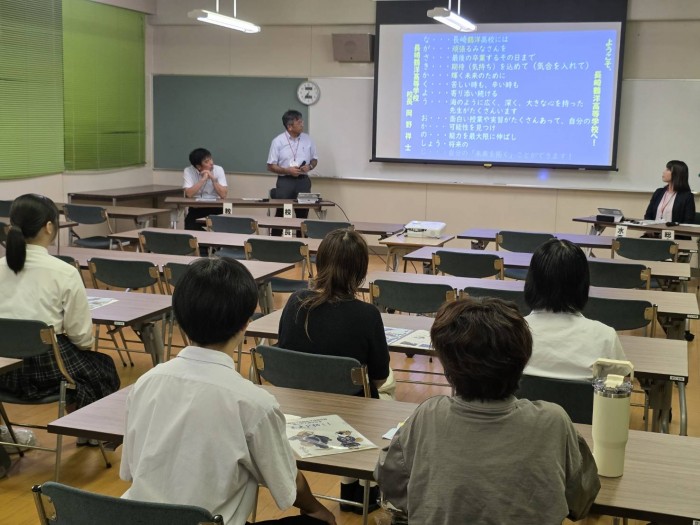 岡野校長あいさつ → 水産科・総合学科の学び → 進路指導に向けた取組 → 質問コーナー