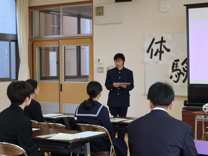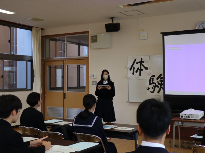 ▲歴史学専攻生徒の体験談では、島外巡検での様子や、学校生活やホームステイの話などを説明しました。