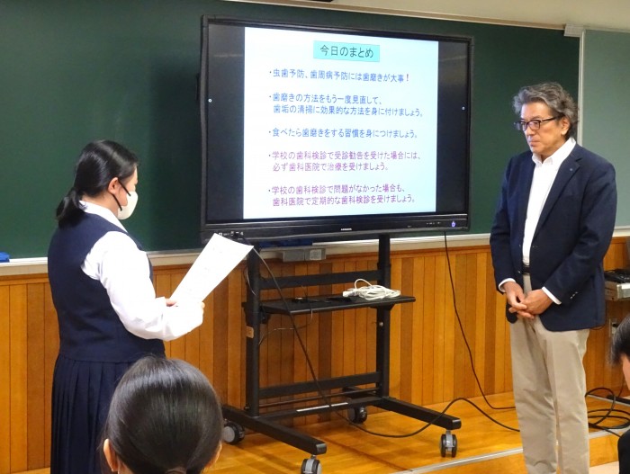 11月14日(金)に歯科講話を実施しました。講師に学校歯科医の小牧憲明先生(こまき歯科医院長)をお招きして、本校での歯と口の健康づくりのための取組につながる講演をしていただきました。生徒たちは、口腔内の環境が全身の健康に影響を与えることや正しい歯の磨き方など、歯と口の健康について多くの知識を得ることができ、自身の日々のブラッシングや食生活について見つめ直す機会となったようです。以下、生徒の感想をまとめたPDFと講演の様子を紹介します。