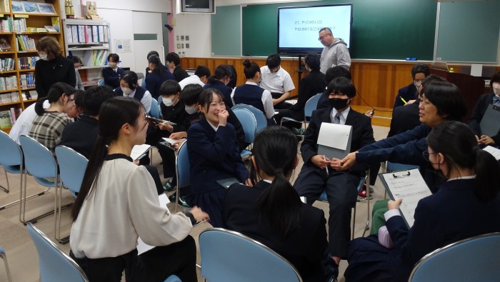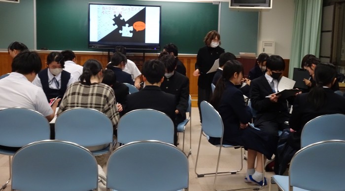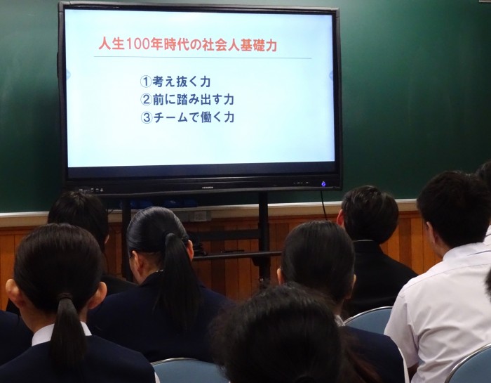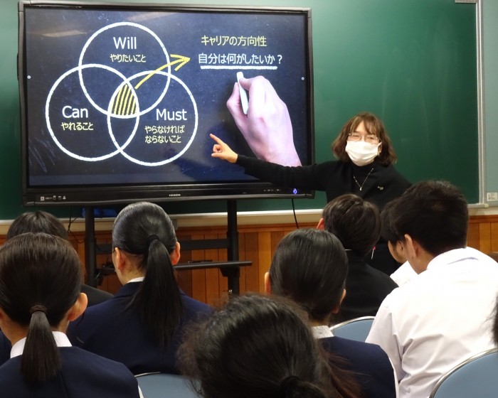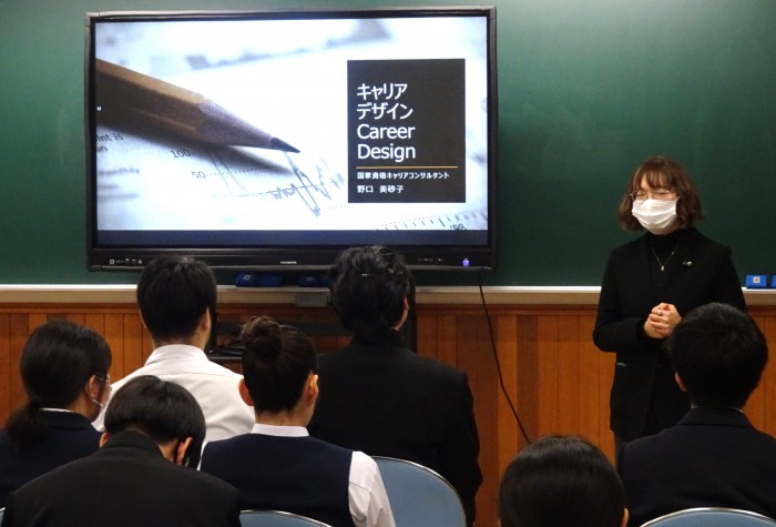 『キャリアデザインについて』をテーマに、前半は講義形式、後半は生徒主体(教員も参加)のワークショップ形式で行い、これまでの自分の振り返りとともに、これからの自分の生き方や働き方について理解を深める有意義な時間となりました。以下、生徒の感想(抜粋)及び活動の様子を紹介します。