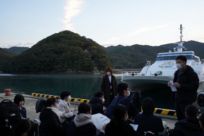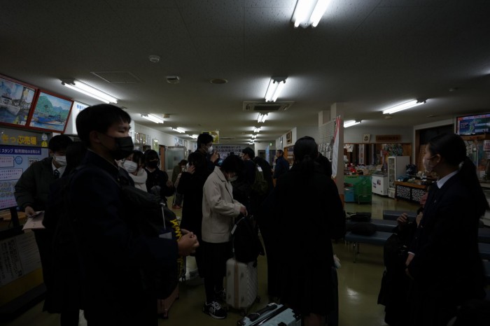 生徒は、薄暗い中、やや緊張した面持ちで7時15分までに鯛ノ浦港ターミナルに集合し、その後、お世話になる添乗員さんへの御挨拶及び引率職員から出発時の説明及び確認等を受けました。