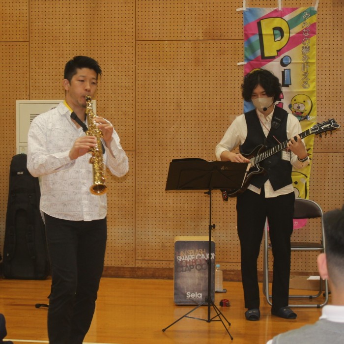 5日は音楽セッションで、サックスとギターの演奏や歌を聴いたり、ウクレレ演奏を体験したりしました。