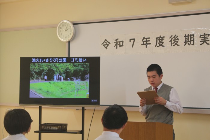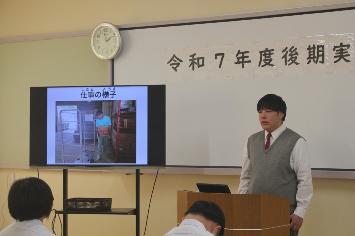 それぞれの生徒が、実習で取り組んだことや目標がどの程度達成できたのか、今後の学校生活でどんなことを頑張るのかを発表しました。