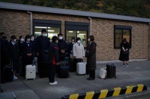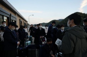 生徒は、薄暗い中、やや緊張した面持ちで7時15分までに鯛ノ浦港ターミナルに集合し、その後、お世話になる添乗員さんへの御挨拶及び引率職員から出発時の説明及び確認等を受けました。